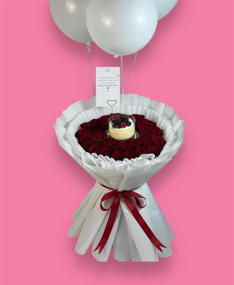بوكيه بتنسيق فاخر أضافه كيك تشيز بيري لذيذ 30 حبه ورد جوري اضافه 3 بالون 🎈 كرت طباعه