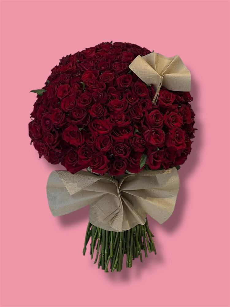 بوكيه 150 حبه جوري احمر بدون قاعده فلين بتنسيق مدرج فاخر اضافة فيونكه لون مميز خيش