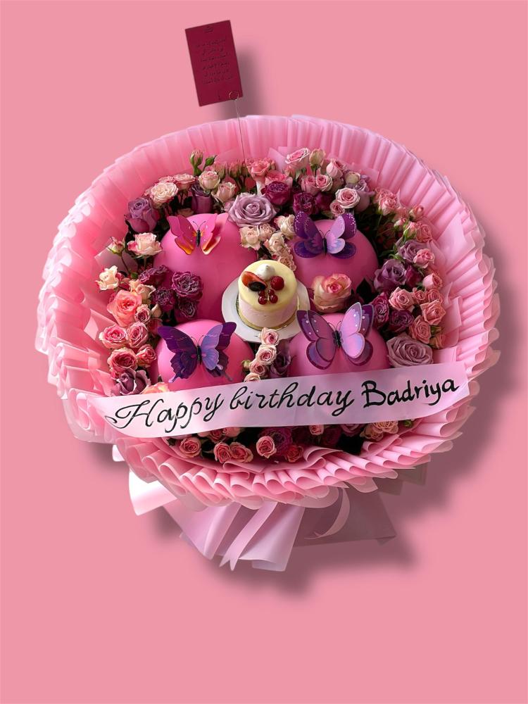 بوكيه بتغليف مميز دبل بالون فرشات ورد ببي روز مكس درجات الوردي اضافه كيك وايت شكلت شخصين شريط شفاف عباره كرت طباعه