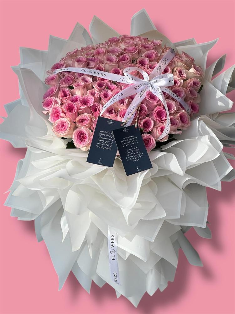 بوكيه بتغليف فاخر دبل عشوائي ورد جوري وردي 100 حبه شريط فيونكه إضافه كروت طباعه